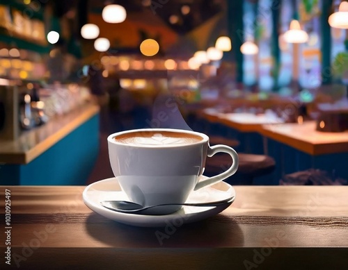 Una taza de café caliente sobre una mesa en una cafeteria de ambiente cálido
