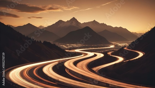 Una vista panorámica de una carretera que serpentea entre montañas al atardecer, con la silueta de un pico de montaña distintivo al fondo. La carretera está iluminada por las estelas de luz de los veh