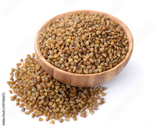 uncooked bitter buckwheat in the wooden bowl, isolated on the white background