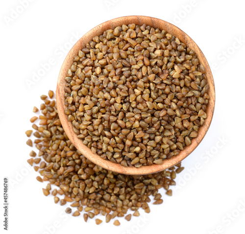 uncooked bitter buckwheat in the wooden bowl, isolated on the white background, top view