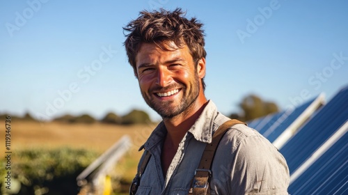 Under a clear blue sky in a sunny, open field, a man in his early 30s with dark brown, neatly styled hair smiles beside a series of solar panels.
