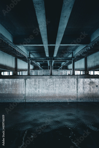 water, bridge, concrete, steel, no one, architecture, dark, empty, urban, symmetry, darkness, rectangle, waterfront, outdoors