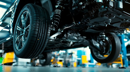 vehicle, undercarriage, suspension, tire, wheel, black, automotive, facility, factory, industrial, metal, part, component, machinery, engineering, technology, design, manufacturing, production, assembly, repair, maintenance, transportation, automobile, motor, car, transport, mechanic, structure, detail, closeup, low angle, shadow, dark, shiny, clean, modern, professional, quality, precision, craftsmanship, robust, hard-wearing, strong, powerful