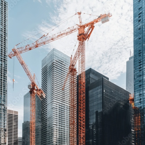 Under-construction city skyline with tall cranes and unfinished buildings, metaphor for growth, transformation, and forward-moving development - landscape machinery equipment