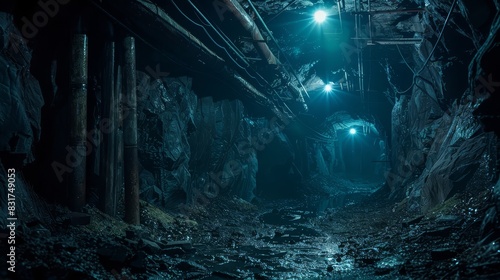 Underground mine shaft with glowing lights, ample text space, dramatic lighting