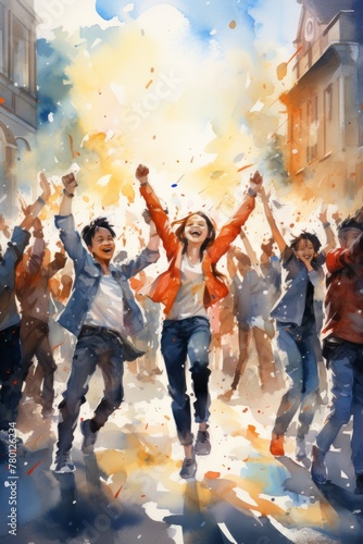 street, dance, performance, group, people, painting, dancing, energetic, bustling, movement, joy, dancer, skill, lively, atmosphere, urban, city, celebration, culture, community, music, rythm, festival, crowd, colourful, expression, art, creativity, entertainment, event, festive, activity, interaction, excitement, happiness, social, gathering, tradition, cultural, choreography, motion, liveliness, teamwork, talent
