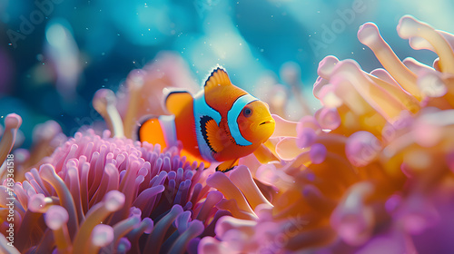Underwater close-up of a colorful clownfish nestled among the tentacles of a sea anemone
