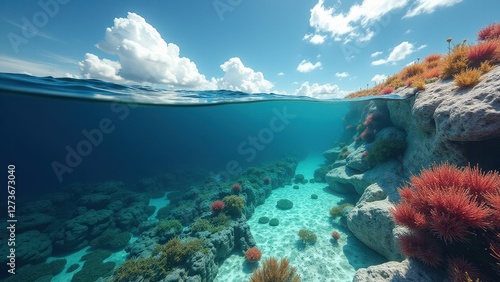 Underwater coral reef ecosystem with sandy ocean floor and sunlight rays