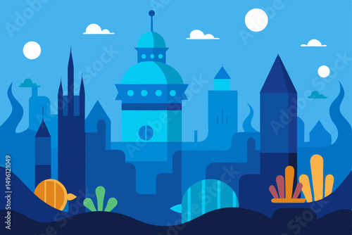 Underwater fantasy city vibrant aquatic metropolis vector illustration background