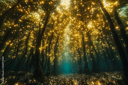 Underwater glowing forest path, magical scene, fantasy background, nature photography