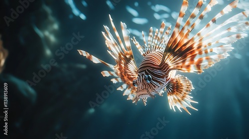 Underwater lionfish portrait, vibrant colors, detailed fins.