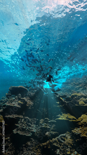 Underwater photography art of a school of fish at the surface in beautiful light. From a scuba dive in Thailand.