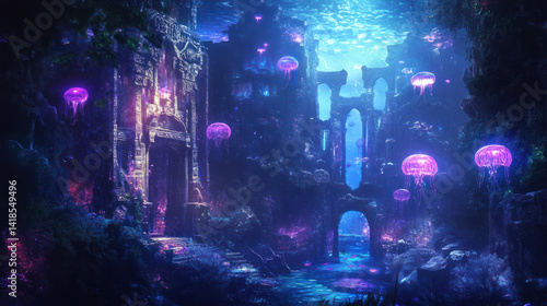 underwater, ruin, ocean, sea, jellyfish, glowing, aglow, fantasy, mysterious, submerged, building, structure, arch, portal, stone, coral, aquatic, deep, blue, purple, light, water, aethereal, vibrant, magical, landscape, environment, cavern, cave, architecture, entrance, passage, scenic, fantastic, illumination, dark, beautiful, calmness, serene, calm, exploration, discovery, reef, marin, flora, fauna