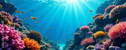 Underwater scene with colorful coral reef and schools of tropical fish swimming, exotic, biodiversity, wildlife