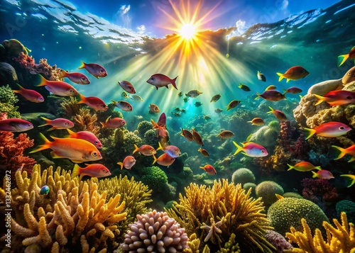 underwater, fish, school of fish, coral reef, ocean, sunlight, marine life, sea, coral, reef, ocean life, ocean life, tropical fish, sun ray, underwater photography, nature, wildlife, beautiful, vibrant, clearwater, algae, seaweed, sunbeam, light rays, natural beauty, ocean floor
