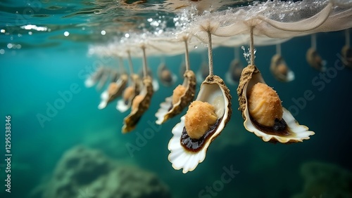 Underwater view of oysters floating in a clear ocean environment showing marine life