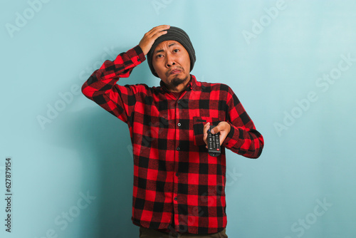 Unhappy young Asian man with a beanie hat and red plaid flannel shirt touching his head while holding a TV remote, isolated on a blue background