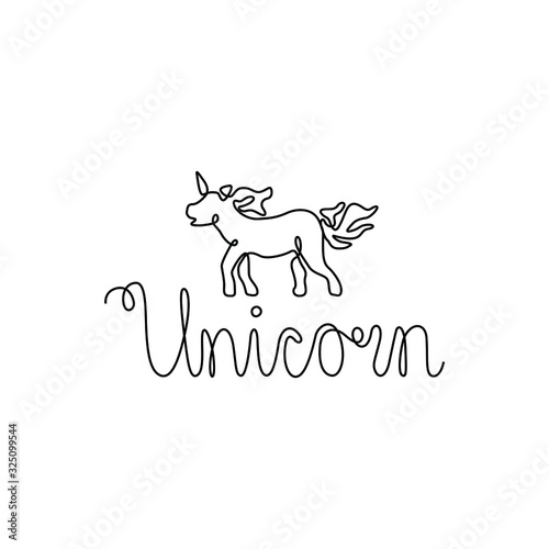 Unicorn continuous line drawing, hand lettering, small tattoo, print for clothes and logo design, emblem or logo design, silhouette one single line on a white background, isolated vector.