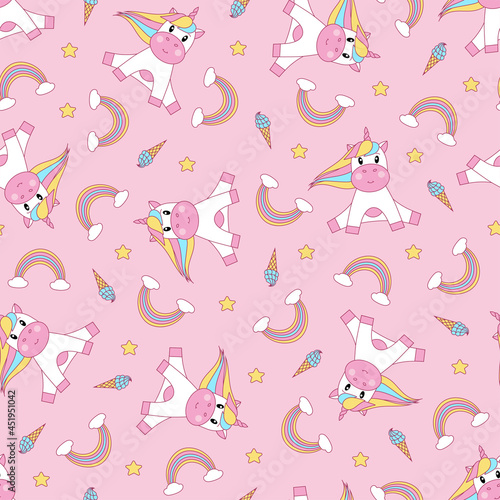 seamless pattern, pink, unicorn, rainbow, cartoon, colourful, background, pattern, seamless, vector, endless, cute, star, sweet, design, art, fabric, ice cream, decoration, textile, print, drawing, magic, element, fantasy, animal, character, drawn, horse, dessert, unusual, repeating, illustration
