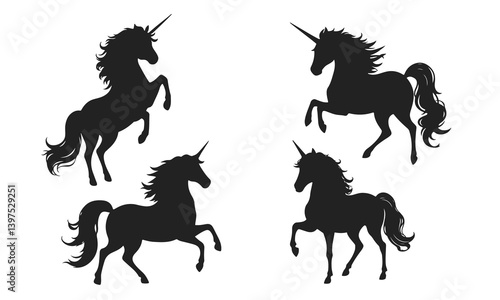 Unicorn silhouette set. Fantasy horse, mythical animal, fairytale design, vector unicorn