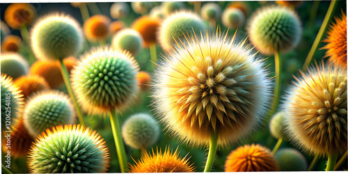 abstract, geometry, fluff, plant, texture, vibrant, natural, environment, botanical, illumination, unique, organic, colourful, sphere, foliage, nature, growth, landscape, detail, soft, round, green, orange, sunshine, aesthetic, visual, composition, design, delicate, flora, airy, symmetric, harmony, beauty, seasonal, serene, tranquil, exotic