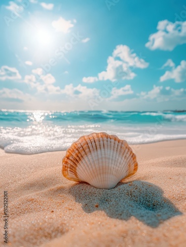 Unique seashell resting on sandy beach under bright sky and sunlight during daytime