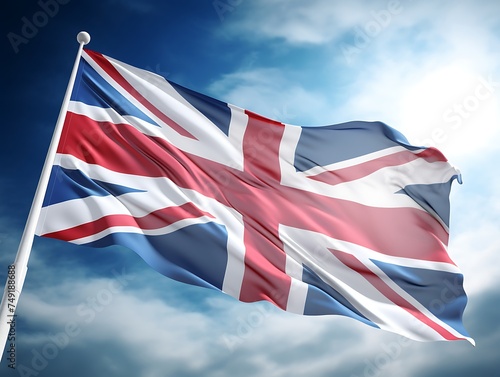 United Kingdom flag waving in the wind against blue sky with white clouds