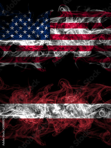 United States of America, America, US, USA, American vs Latvia, Latvvian smoky mystic flags placed side by side. Thick colored silky abstract smoke flags