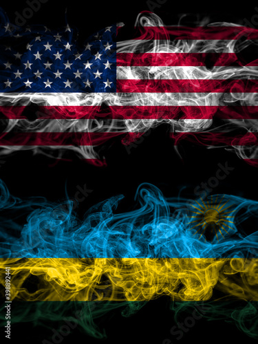 United States of America, America, US, USA, American vs Rwanda smoky mystic flags placed side by side. Thick colored silky abstract smoke flags