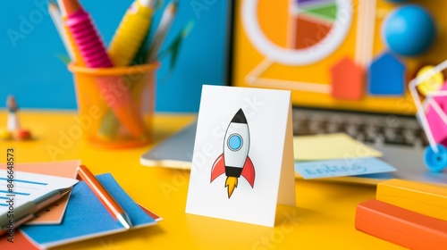 Unleashing Innovation Modern Entrepreneurial Workspace with Business Cards Rockets and Charts