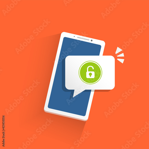 Unlock sign notification concept. Padlock mark sign notification on the smartphone screen. Vector illustration in flat style