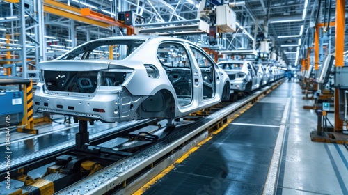 car, factory, manufacturing, assembly, production, line, belt, conveyer, automotive, industry, metal, body, chassis, frame, vehicle, part, automation, robotic, equipment, machinery, men at work, plant, process, transportation, technology, modern, industrial, engineering, logistic, warehouse, floor, steel, grey, white, yellow, blue, black
