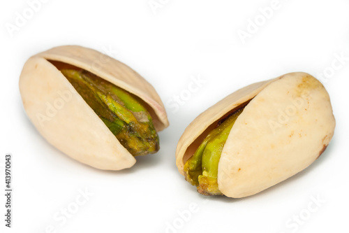Unpeeled pistachio nuts isolated on white background