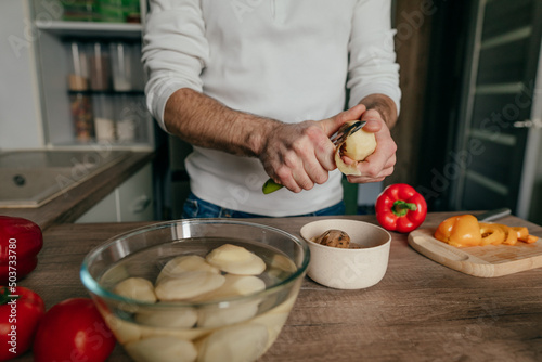 man, cooking, food, potato, preparation, home, kitchen, vegetable, making, cleaning, board, knife, utensil, ingredient, fresh, work, young, health, healthy, cook, hand, raw, chef, chief, peeling, closeup, male, unrecognizable, preparing, peel, table, holding, lifestyle, wooden, uncooked, occupation, vegetarian, people, peeler, selective focus, person, organic, cut, cutting, vegan, natural, root, background