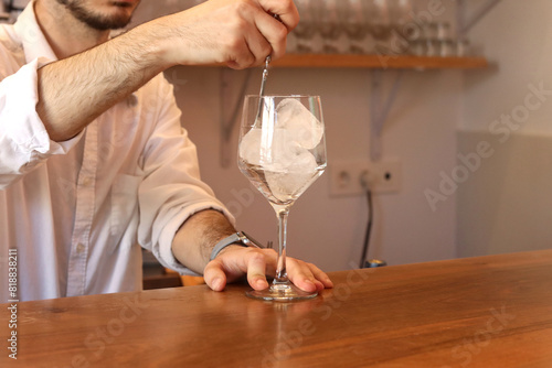 Unrecognizable waiter making a cocktail without a drink spinning the ice inside a basement, in a bar