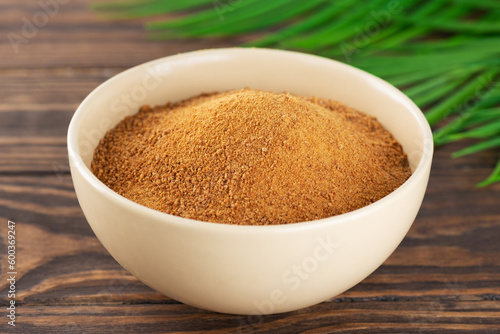Unrefined cane sugar Panela in a bowl, closeup.
