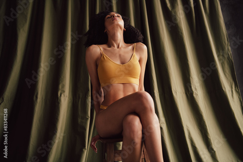 Unretouched portrait of gorgeous model girl closed eyes sitting chair khaki curtain background