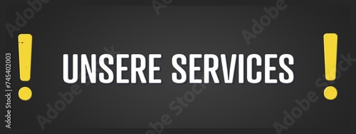 Unsere Services. Eine schwarze Tafel mit weissem Text. Illustration mit Grunge Textstil.