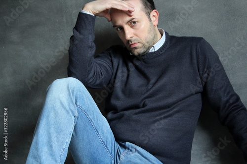 cephalalgia, concentration, sorrowful, tension, malfunction, distress, danger, sick, junkie, accident, twinge, man, athlete, house, pensive, nuisance, young, beauty, sad, alone, solitaire, jean, casual clothes, jumper, shirt, office, grey, funky, sexy, trepidation, hand, grieved
