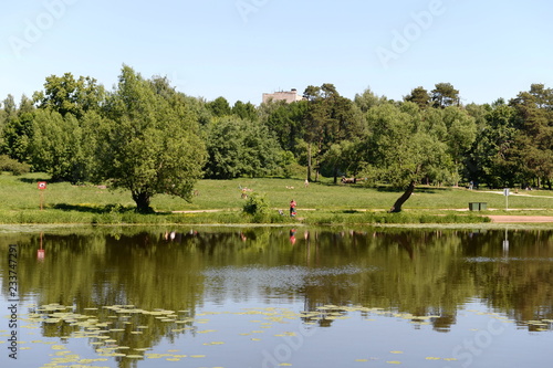 moscow, russia, russian, stone, sunny, city, capital, manor, park, duck pond, walk, may, tree, summer, rest, holiday, heat, upper, resting, people, day, blue, sky, forest, shore, green, grass, water, natural, historical, forest park, dam, sunbathe