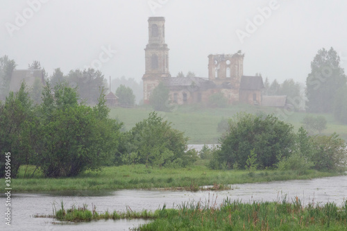 Upper Volga landscape. Ruins of the church on the bank of Sterzh Lake. Novinka village, Tver Oblast, Russia.