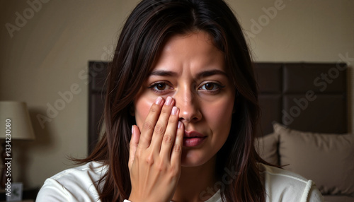 woman, upset, sad, crying, emotional, tear, worried, distressed, grieved, anxiety, heartache, loneliness, pensive, pain, serious, contemplation, vulnerable, stress, indoor, bedchamber, bed, dramatic, melancholic, moody, solitude, depression, bruised, introspection, despair, tense, thinking, closeup, expression, uncertainty