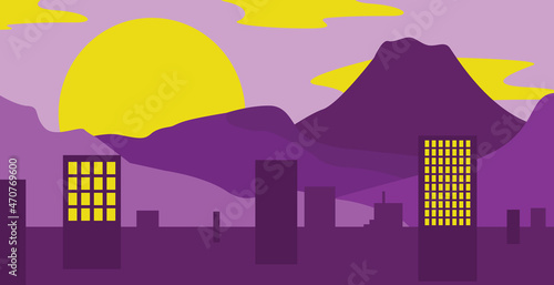 Urban and mountain background with bright yellow sun and purple shades, for ui ux design or graphic design needs