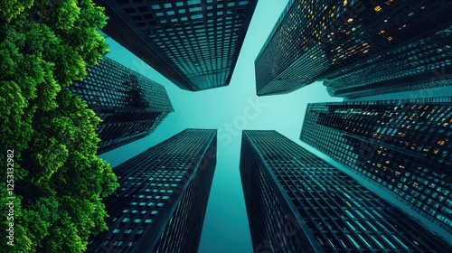 urban, building, greenery, perspective, low angle, city landscape, architecture, modern, skyscraper, nature, skyline, sunlit, glasses, concrete, environment, daylight, blue, forest, growth, calmness, design, pattern, height, green, city, environmental, scenic, vibrant, landscape, structure, view, reflections, horizon, travel, botanical, urban life, bright, mixed, eco