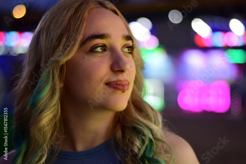 beauty, blond, bokeh, city, closeup, colourful, curly hair, cute, enjoy, entertainment, female, festival, fun, game, girl, hair, coiffure, happiness, happy, illuminated, joy, leisure, lifestyle, light, lip, music, neon, night, nightlight, nightlife, night time, outfit, piercing, play, portrait, smile, street, summer, sweet, vibrant, weekend, wheel, woman, young, youth