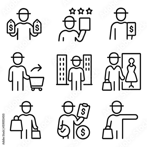 Urban Consumer Icons. Outline style icons of Urban Consumer Behavior: comparing prices, product review stars, mobile price check,