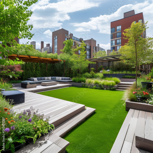 Urban neighbourhood garden, urban house, wide shots of home gardens, lawns, yards, decks and spaces for outdoor entertaining