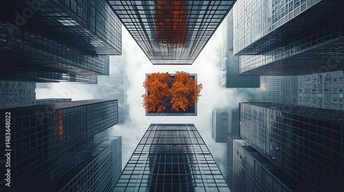 city, skyscraper, urban, tree, autumn, fall, foliage, view, architecture, sky, modern, metal, glasses, building, exterior, top, bottom, perspective, daylight, fog, cloud, concrete, nature, city landscape, environment, green, orange, red, design, photo, tower block, commercial, business, downtown, city landscape, contemporary, structure, panorama, foggy, autumn, aerial