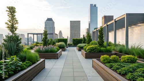 Urban rooftop garden offers a peaceful oasis amidst city skyscrapers, perfect for urban planning, sustainability, and landscape design projects.