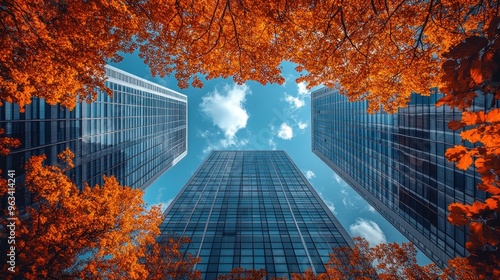 city, building, architecture, skyline, tree, leaf, autumn, nature, sky, cloud, perspective, modern, glasses, urban, environment, colours, landscape, outdoors, season, foliage, tranquil, beauty, contrast, view, height, growth, design, structure, reflections, sunlight, atmosphere, peaceful, blue, orange, vibrant, scenery, natural, urbanism, photo, daylight, seasonal, calmness, framing, visual, composition, aesthetic, line